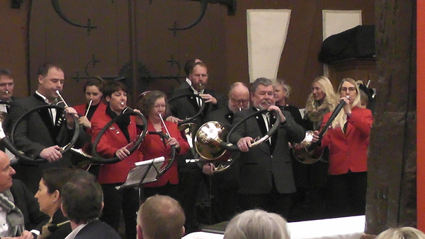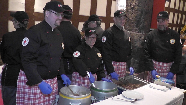 Und dann wurde aufgetischt: Die Kochgruppe der Frankenberger DRK-Bereitschaft das Essen in riesigen Kesseln zubereitet: 35 Kilo Kartoffeln, 50 Kilo Grünkohl und 300 Pinkel warten darauf von den Mitgliedern der Lions den Gästen serviert zu werden. Zwölf DRK-Helfer füllten die Teller, die dann an die Sitzplätze gebracht wurden. Musikalisch unterhielt die Bläsergruppe der Jägervereinigung Frankenberg die Gäste.