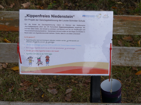 Niedenstein(pm). Weggeworfene Plastikbecher, Verpackungen oder Zigarettenstummel – zu viel Plastikmüll landet in der Natur. Die Schüler*innen der Louise-Schröder-Schule in Niedenstein haben das Problem längst erkannt: „Kippenfreies Niedenstein“ heißt das Projekt zur Nachhaltigkeit, mit dem sie Bürger an Sitzbänken überall in der Gemeinde auffordern, ihre Zigarettenstummel in eigens aufgehängten Dosenbechern zu entsorgen. „Dies ist absolut vorbildlich“, sagt Dr. Bettina Hoffmann(Bündnis 90/ Die Grünen), Bundestagsabgeordnete aus Niedenstein. Denn der viele Müll belaste die Umwelt und sorge für hohe Entsorgungskosten.