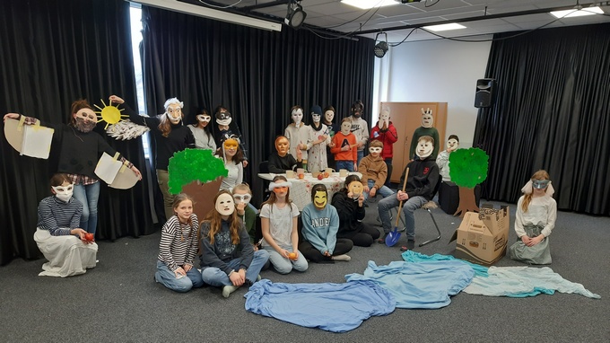 Nach dem Vorbild des antiken griechischen Theaters wurden die Sagen in Gruppen inszeniert. Hierfür wurden die Rollen der Schauspieler und des Chors verteilt, die Texte geschrieben und das Schauspiel sowie der anspruchsvolle Wechsel zwischen den Szenen und den Überleitungen des Chors eingeübt. Abschließend wurden die Masken gebastelt sowie Requisiten organisiert. Die Präsentation war ein eindrucksvoller Beweis für die Kreativität der Klasse sowie die Faszination der griechischen Geschichte bis in die Gegenwart.