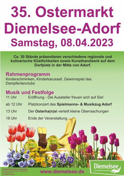Die über 30 Stände bieten unter anderem Kunsthandwerk, Schmuck, Bienenprodukte,leckere Wurstwaren, Selbstgebasteltes aus Holz, handgestrickte Socken und Mützen, Kinderspielzeug, Süßwaren, Geschenkartikel und Garten-Deko. Damit den kleinen Gästen nicht langweilig wird, bieten die Organisatoren wieder ein kleines Kinderkarussell an. Der Osterha(n)si darf natürlich auch nicht fehlen: Ab 13 Uhr verteilt der lustige Körbchenträger eine Kiepe süßer und bunter Eier unter allen Kindern des Ostermarktes und präsentiert sich auch gern mit den vielen Kindern als Fotomotiv für das Urlaubsalbum. Auch wird Kinderschminken angeboten. Der Dampfentenclub veranstaltet ein Gewinnspiel und der Spielmanns-und Musikzug Adorf spielt wieder ein Ständchen. Beginnen wird der Adorfer Ostermarkt um 11.00 Uhr und das Ende der st gegen 18.00 Uhr.