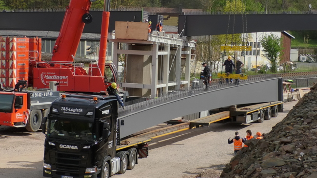Bereits in der Nacht von Donnerstag auf Freitag wurden die Elemente von der Produktionsstätte in Thüringen über die Autobahn und Bundesstraße transportiert und dann über die neue Trasse der Ortsumgehung bis zur Einbaustelle sukzessive angefahren. Das Auflegen der Fertigteile erfolgte direkt vom Tieflader auf eine Hilfskonstruktion an den neuen Wiederlagern und Brückenpfeilern. Die Spannweite der jeweiligen Elemente beträgt 30 bzw. 35 Meter, bei einem Gewicht von bis