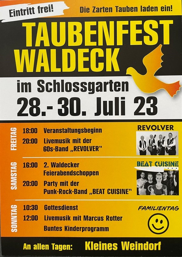 An allen Tagen bietet, solange der Vorrat reicht, auch wieder Köstlichkeiten aus dem Essenstand, wie z.B.: Schepperlinge, Bratwurst und Pommes und Flammkuchen an. Freitag und Samstag hat zudem das “Kleine Weindorf“ geöffnet, hier wird es neben erlesenen Weinen auch wieder zusätzlich den ein oder anderen sommerlichen Cocktail geben. Der Eintritt ist an allen Tagen frei. Die Zarten Tauben aus Waldeck freuen sich auf viele Gästevon nah und fern sowie auf und ein schönes, stimmungsvolles und friedliches Sommerfest im Schlossgarten in Waldeck.