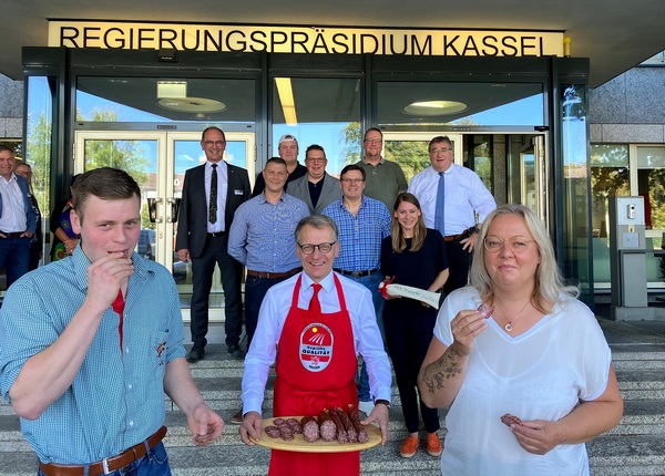 Gießen/Kassel(pm). „Die Verbraucherinnen und Verbraucher können sich darauf verlassen, dass nur das drin ist, was in die echte nordhessische Ahle Wurscht gehört“, versprach Gießens Regierungspräsident Dr. Christoph Ullrich. In den Räumen des Regierungspräsidiums Kassel wurden die ersten Prüfbescheinigungen zur Vermarktung der „Nordhessischen Ahlen Wurscht g.g.A.“ an acht Metzgereien aus Nordhessen übergeben. Das Regierungspräsidium Gießen ist hessenweit zuständig für die Erteilung und Kontrolle der europäischen Schutzsiegel. „g.g.A.“ steht dabei für „geschützte geografische Angabe“. Es ist kein alltäglicher Termin, wenn der Gießener Behördenleiter die Begrüßung in der Kasseler Schwesterbehörde übernimmt. Aber auch, wenn es sich bei der Nordhessischen Ahlen Wurscht um ein echtes kulinarisches Kulturgut handelt, ist das Regierungspräsidium Gießen hessenweit zuständig. So wie bei den anderen durch die Europäische Union geschützten Produkten wie der Frankfurter Grünen Soße, dem Odenwälder Frühstückskäse oder dem Hessischen Handkäs. „Seit Juni gehört auch die Nordhessische Ahle Wurscht dazu – quasi der Parmaschinken Hessens“, wie Dr. Ullrich anlässlich der feierlichen Übergabe der Prüfbescheinigungen erklärte.