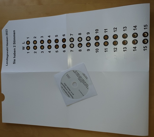 „Die rechte obere Ecke jedes Stimmzettels ist gelocht oder sie ist abgeschnitten. So kann der Stimmzettel in der Wahlkabine korrekt in die Schablone eingelegt werden“, erklärt Peter Klug. Doch welche Nummer steht für welche Partei? Hierzu erhalten seheingeschränkte Menschen zusammen mit der Wahlschablone eine Audio-CD, die der Deutsche Verein der Blinden und Sehbehinderten in Studium und Beruf (DVBS e.V.) erstellt. Auf dieser CD wird erklärt, wie der Stimmzettel aufgebaut ist und wie die Wahlschablone benutzt werden kann. Außerdem enthält sie Informationen zu Kandidatinnen, Kandidaten und Parteien, die zur Wahl antreten und welche Nummern ihnen zugeordnet sind. So kann mit der Wahlschablone das richtige Loch für das entsprechende Wahlkreuz gefunden werden.