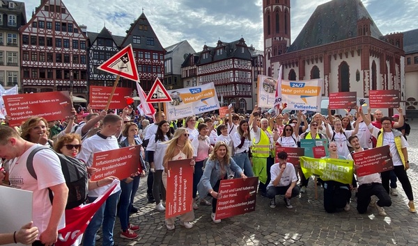 Frankenberg/Korbach/Frankfurt(pm).Die Krankenhäuser in Frankenberg und Korbach fordern von der Bundesregierung eine ausreichende und dauerhafte Finanzierung der hohen Inflationskosten und der für das Jahr 2024 beschlossenen Tariferhöhung von rund zehn Prozent. Deutschlandweit stehen die Krankenhäuser vor extremen Herausforderungen, weil sie durch enorm gestiegene Kosten immer mehr in eine wirtschaftliche Schieflage geraten. Bisher weigere sich der Bund seinem gesetzlichen Auftrag nachzukommen und eine den steigenden Betriebskosten angemessene Vergütung für die Kliniken zu ermöglichen. Mit dem Ziel, für eine auskömmliche finanzielle Absicherung der Daseinsvorsorge zu protestieren, sind Mitarbeiterinnen und Mitarbeiter beider Kliniken gemeinsam am Frankfurter Römer auf die Straße gegangen.