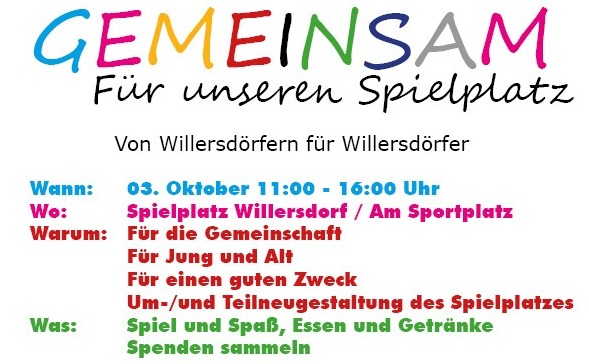 Frankenberg-Willersdorf(pm). Willersdorf hat einen recht schönen Spielplatz, dem einfach die Liebe zum Detail fehlt und zudem bedarf es ein paar Neuerungen. So ist aus einer kleinen Idee ein Projekt entstanden, eine aktuelle Herzensangelegenheit. Mit Unterstützung der drei örtlichen Vereine organisiert Carolin Krautwald in Absprache mit der Stadt Frankenberg Eder das Fest. Ziel ist es Spendengelder zu generieren und die Gemeinschaft zu stärken. Bereits im Vorfeld haben man das Budget für den Wunsch „Bodentrampolin“ erreicht. Es haben viele Privatperson und auch einige Firmen das Projekt unterstützt. Zudem gibt es Sachspenden mit denen Aktionen am Tag selbst geplant sind. Am Festtag werden der Gewinn aus dem Verkauf von Speisen und Getränke in voller Höhe gespendet, und es findet eine kleine Versteigerung statt. Der Erlös wird ebenfalls gespendet. Privatperson können auf folgender Spendenseite ihren Beitrag im Vorfeld leisten:https://www.spendenseite.de/aktion/65028 oder am Festtag selbst spenden.