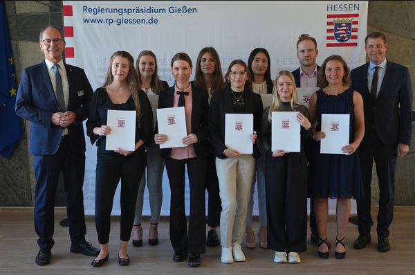Gießen(pm). „Sie haben Großartiges erreicht. Unter mehreren hundert Absolventinnen und Absolventen die neun Besten zu sein – das ist für Sie persönlich ein Riesenerfolg.“ Mit diesen Worten gratulierte der Gießener Regierungspräsident Dr. Christoph Ullrich neun Frauen und Männern aus ganz Hessen. Er ehrte gemeinsam mit Hendrik Schultz (Hessisches Ministerium des Innern und für Sport, Abteilungsleiter der Zentralabteilung) die landesbesten Auszubildenden in Verwaltungsberufen des Jahres 2023. Glückwünsche kamen auch von Peter Erbe (Schulleiter des Hessischen Verwaltungsschulverbandes) und dem Gießener Regierungsvizepräsidenten Martin Rößler.