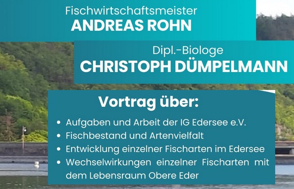 Ederbringhausen(pm). Am 3. November laden die IG Edersee e.V., der AV Ederbringhausen e.V. und der FV Kirchlotheim/Schmittlotheim. V. zu einem Vortrag mit dem Fischwirtschaftsmeister Andreas Rohn und dem Biologen Christoph Dümpelmann nach Ederbringhausen in die Orketalhalle ein. Beginn ist 19 Uhr. Themen sind: Aufgaben und Arbeit der IG Edersee, Fischbestand und Artenvielfalt, Entwicklung einzelner Fischarten im Edersee sowie Wechselwirkung einzelner Fischarten in dem Lebensraum Obere Eder. Der Eintritt ist frei.