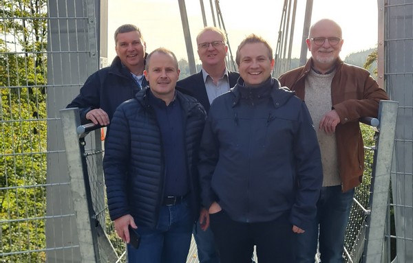 Willingen(pm). Eine Delegation der SPD-Kreistagsfraktion startete ihre Herbstsitzung morgens um 9:00 Uhr in Willingen auf ungewöhnliche Weise: mit dem Aufstieg der 770 Stufen vom Parkplatz bis zur Mühlenkopfschanze und dem Einstieg in den Skywalk auf dem Mühlenkopf, denn die Standseilbahn fährt erst ab 10:00 Uhr. Wieder bei Atem erklärte der Fraktionsvorsitzende Karl-Heinz Kalhöfer-Köchling mit einem Schmunzeln: „Andere benötigen vielleicht einen Stairmaster in der Mucki-Bude, aber wir nutzen gerne die örtlichen Gegebenheiten.“ Die Teilnehmer wurden für ihre sportliche Aktivität mit einer atemberaubenden Aussicht auf den Musenberg belohnt, während ihr Zieleinlauf schließlich am Skywalk erfolgte, wo sie von Melanie Wilke und Arndt Brüne herzlich empfangen wurden. Diese zwei Mitglieder der Geschäftsführung, gaben Einblicke in die Entstehungsgeschichte des Skywalks. Was 2016 als Idee für den Diemelsee begann, hat sich nach sieben Jahren zu einem bedeutenden Tourismusprojekt entwickelt, das seine Tore im Sommer 2023 in Willingen geöffnet hat. Dabei kam der Standort Willingen erst in einem späteren Projektstadium ins Spiel, nicht zuletzt aufgrund der bereits bestehenden Infrastruktur und des hier neben der Schanze weniger gravierenden Eingriffs in die Natur als anderswo. „Lediglich 100 Quadratmeter Fläche waren für die Brücke nötig. Es gibt übrigens eine etwa 70m längere tschechische Hängebrücke. Die ist aber über die ganze Länge durch seitliche Seile abgespannt. Das haben wir nur über die ersten bzw. letzten 20 Meter. Wir haben hier also die längste frei hängende Hängebrücke der Welt“, erklärte Arndt Brüne.