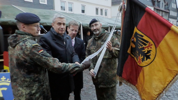 Frankenberg(od). Bei einem feierlichen Appell auf dem Frankenberger Obermarkt wurde die Fahnenbänder der Öffentlichkeit präsentiert. 203 Soldatinnen und Soldaten nahmen Paradeaufstellung und die Ehrenformation marschierte mit dem Heereskorps Kassel, Leitung Oberstleutnant Tobias Terhardt, ein. Die Fahnenbänder waren zwar schon am 30. Uni in Daun/Eifel für Auslandseinsätze und anerkannte Missionen verliehen worden, aber die Frankenberg Soldatinnen und Soldaten gehören zur Stadt Frankenberg, deshalb war es dem Bataillon ein besonders Anliegen diese hohe militärische Ehre auch der Frankenberger Bevölkerung in einem feierlichen Appell zu präsentieren. Zahlreiche Ehrengäste aus der Bundeswehr sowie Politiker, ehemalige Soldaten und Personen des öffentlichen Lebens nahmen an der Zeremonie teil.