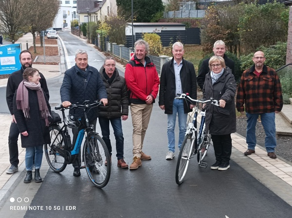 „Der Zustand der Straße war zuletzt sehr schlecht, jetzt bietet die Straße gute Möglichkeiten für alle“, erklärte Bürgermeister Rüdiger Heß bei der Eröffnung mit Anliegern sowie Vertetern der Baufirma Hugo Pieper, von Stadtverwaltung, Landkreis und EGF. „Wir haben die letzten Jahre viel für den Radverkehr gemacht, vor allem dank der Förderung durch Bund, Land und Landkreis.“ Das vom Parlament beschlossene Radverkehrskonzept sei ein gutes Konzept. „Aber wer in Frankenberg Auto fahren will und muss, der soll das in Zukunft auch weiter tun können“, betonte Heß. „Der Firma Pieper sage ich vielen Dank für die gute und zuverlässige Arbeit, auch den Anliegern hier in der Straße vielen Dank für ihre Geduld und Bereitschaft, diese Maßnahme mitzutragen.“ Mit der Einrichtung der Fahrradstraße wird den Radfahrenden bei einer Fahrbahnbreite von 3,5 m mehr Raum und vor allem Vorrang vor dem Kfz-Verkehr gegeben werden. Der Anliegerverkehr ist weiterhin aus Richtung Bahnhofstraße frei, Radfahrende können die Straße weiterhin in beide Richtungen nutzen. Auch die Fußgänger haben ab sofort mehr Platz, denn der Gehweg wurde als separate Anlage mit einer Breite von 2,5 m erstellt. In der Fahrradstraße gilt ab sofort: Fahrräder haben Vorrang, mehrere Radfahrende dürfen auch ausdrücklich nebeneinander fahren. Für alle Verkehrsteilnehmenden gilt dabei die Höchstgeschwindigkeit von 30 km/h. Große Banner weisen mit Piktogrammen auf die wichtigsten Regeln hin.