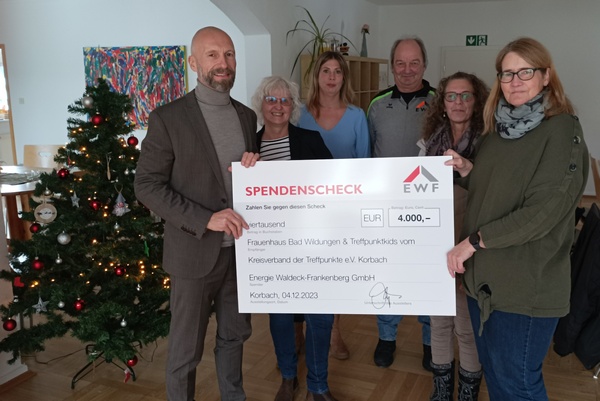 Korbach(pm). Die Energie Waldeck-Frankenberg rief in diesem Jahr ihre Mitarbeiterinnen und Mitarbeiter mit der Initiative „bewegt durch 2023“ erneut dazu auf, sich fit zu halten und gleichzeitig einen Spendentopf für den guten Zweck zu füllen. Für die Treffpunktkids in Korbach und das Frauenhaus in Bad Wildungen kamen insgesamt 4.000 Euro zusammen, die am 4. Dezember offiziell durch den Geschäftsführer Frank Benz übergeben wurden. An der Initiative beteiligten sich das gesamte Jahr über 92 Mitarbeiterinnen und Mitarbeiter, die zusammen einen Spendenbetrag in Höhe von 6.221,60 Euro erreichten. Die EWF rundete auf und spendet insgesamt 6.600 Euro. Den Großteil des Betrags erhalten zwei heimische Einrichtungen, die mit ihrem Angebot Menschen in Notlagen zur Seite stehen: Die Treffpunktkids in Korbach und das Frauenhaus in Bad Wildungen. „Es freut mich, dass so viele Mitarbeiterinnen und Mitarbeiter das gesamte Jahr über mitgemacht