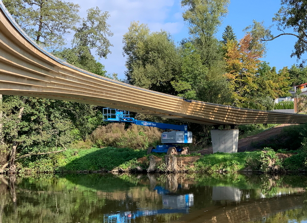 Frankenberg(pm). Die neu gebaute Ederdorfbrücke an der Ruhrstraße in Frankenberg (Eder) bleibt voraussichtlich noch bis Ende des Monats gesperrt und kann damit erst nach dem Frankenberger Pfingstmarkt eröffnet werden. Grund sind die immer noch andauernden Sanierungsarbeiten am Betonbelag. Im Rahmen der Gewährleistung müssen an den Betonplatten auf der Brücke noch Nacharbeiten erledigt werden. Die Betonplatten waren zum Teil beim Transport beschädigt worden und wiesen zudem bei der Montage zu große Versätze auf. Erst wenn die Betonsanierung abgeschlossen ist, kann als letzter Arbeitsschritt die Epoxidharzbeschichtung als Fahrbahnbelag aufgebracht und die Brücke für den Verkehr geöffnet werden. Ende Mai sollen alle Arbeiten abgeschlossen sein.
