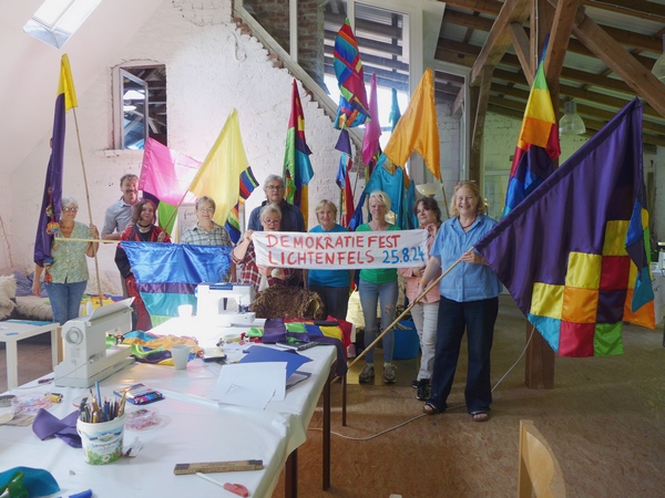 Aber auch, wer nicht nähen mag, kann sich einbringen: Es geht um Stoffe schneiden, Bambusstangen vorbereiten, Plätze suchen, Ausstellung planen, Eisenstangen einschlagen und die Fahnen mit Stangen montieren. Jeder kann alles ausprobieren, oder nur das, was zusagt. Die Vereinsmitglieder freuen sich auf Neugierige, die sich 3 Stunden oder 3 Tage engagieren wollen. Herzliche Einladung zum Mitmachen. Diese partizipative Installation bleibt bis zum Demokratiefest Lichtenfels ausgestellt. Ein gemeinsames Drohnenfoto mit allen Lichtenfelser Bürgerinnen und Bürgern am 25.8.24 ist geplant. Der Workshop farbenfroh 2 findet vom 16.-18.8.24 am Freitag ab 18 Uhr, am Samstag von 10Uhr – 18 Uhr und am Sonntag nach Absprache im Vereinsheim „bewegter wind“, Orker Str. 11 (Hintergebäude), Lichtenfels – Sachsenberg statt. Der Sonntag ist voraussichtlich für den Aufbau vorgesehen. Nähmaschinen und große Vorschlaghämmer (für die Eisenstangen) nach Absprache bitte mitbringen. Melden Sie sich gerne, wenn Sie Fragen haben oder sich anmelden wollen: mail@bewegter-wind.de oder bei Reta Reinl Tel. 06454-1445