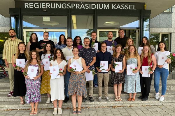 Kassel(pm). Insgesamt 24 Auszubildende und Studierende schließen ihre Berufsausbildung beim Regierungspräsidium (RP) Kassel in diesem Jahr erfolgreich ab. Die Absolventinnen und Absolventen werden übernommen und setzen ihre Karriere beim RP Kassel als attraktivem Arbeitgeber in NordOstHessen fort. Von Wissensmanagement und Public Service Motivation über Shared Desk Konzepte und Coworking Spaces bis hin zu aktuellen Rechtsfragen im Bereich Waffenrecht bzw. Jagdrecht: So vielseitig wie die Themen der Bachelorarbeiten der Inspektoranwärterinnen und -anwärter sind nun auch ihre Einsatzgebiete im Regierungspräsidium Kassel. Neun Absolventinnen und Absolventen erhielten Mitte August von Regierungspräsident Mark Weinmeister ihre Ernennungsurkunden zu Inspektorinnen und Inspektoren auf Probe. Nach einem dreijährigen Dualen Studium für den gehobenen Dienst der allgemeinen Verwaltung im Bereich Public Administration treten sie nun ihren Dienst beim RP Kassel an. Zum zweiten Mal wurden auch zwei Absolventen aus dem Studiengang Digitale Verwaltung ihre Ernennungsurkunden überreicht. Bereits im Juni und Juli hatten neun Verwaltungsfachangestellte und ein Fachinformatiker für Systemintegration ihre dreijährige Ausbildung beim Regierungspräsidium Kassel beendet. Ende September und Anfang Oktober werden dann noch zwei Referendarinnen und Referendare in der Umweltverwaltung und ein technischer Referendar im Bereich Arbeitsschutz ihren Vorbereitungsdienst abschließen. Regierungspräsident Mark Weinmeister hieß die neuen Kolleginnen und Kollegen herzlich im RP Kassel willkommen und gratulierte zur erfolgreich absolvierten Ausbildungs- und Studienzeit: „Wir brauchen fähige und motivierte Mitarbeitende, um gemeinsam die Zukunft NordOstHessens zu gestalten. Das Regierungspräsidium Kassel ist eine moderne Dienstleistungsbehörde, die sich stetig weiterentwickelt. Bringen Sie neue Ideen ein und bringen Sie mit Ihrer Mitarbeit unsere