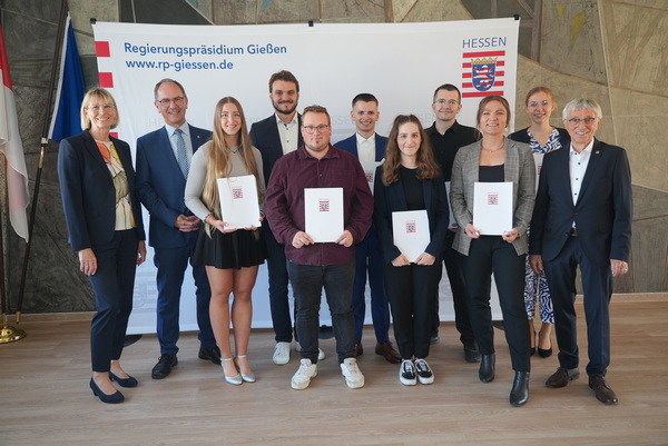 Gießen(pm). Dr. Christoph Ullrich (Regierungspräsident Gießen) und Susanne Reul (Hessisches Ministerium des Innern, für Sicherheit und Heimatschutz) ehren landesbeste Auszubildende in Verwaltungsberufen des Jahres 2024 „Der Abschluss Ihrer Ausbildung markiert sowohl ein Ende als auch einen Anfang. Es ist das Ende einer intensiven Zeit des Lernens, der beruflichen Orientierung und des Einstiegs in das Berufsleben. Gleichzeitig ist es der Beginn eines neuen Kapitels in Ihrem Leben. Mit den Leistungen, die Sie als Landesbeste erreicht haben, besitzen Sie das Rüstzeug, eine erfolgreiche Zukunft zu gestalten.“ Mit herzlichen Worten gratulierte der Gießener Regierungspräsident Dr. Christoph Ullrich neun Frauen und Männern aus mehreren Teilen Hessens. Er ehrte gemeinsam mit Susanne Reul, Referatsleiterin für Grundsatzangelegenheiten Personal im Hessischen Ministerium des Innern, für Sicherheit und Heimatschutz, die landesbesten Auszubildenden in Verwaltungsberufen des Jahres 2024 und wünschte ihnen alles Gute für ihren weiteren beruflichen Weg. Glückwünsche kamen auch von Detlef Ruffert, Verbandsvorsteher des Hessischen Verwaltungsschulverbandes. „Unter zahlreichen Absolventinnen und Absolventen in allen hessischen Behörden zu den neun Besten zu gehören, ist ein bemerkenswerter persönlicher Erfolg“, betonte Dr. Christoph Ullrich. Er freute sich, dass dabei die gesamte Kommunale Familie vertreten ist: von ländlichen Kommunen über Großstädte bis hin zu Landkreisen. „Das zeigt, dass die Bürgerinnen und Bürger überall auf eine leistungsfähige Verwaltung treffen.“ Ullrich erklärte auch, warum die Ehrung in Gießen stattfand. „Das Regierungspräsidium Gießen ist seit über 20 Jahren eine zentrale Kompetenzstelle in Hessen für alle ausbildungsrelevanten Angelegenheiten der Berufe Verwaltungsfachangestellte und Fachangestellte für Medien- und Informationsdienste. Was in anderen Berufen die Industrie- und Handelskammer ist, ist das RP Gießen für die Verwaltungsausbildung.“ Die Behörde prüft unter anderem die Eignung der Ausbilderinnen und Ausbilder sowie die Ausbildungsverträge und die Ausbildungspläne. Zudem führt das Regierungspräsidium die Prüfungen in Zusammenarbeit mit den jeweiligen Ausschüssen, den Berufsschulen sowie den Verwaltungsseminaren durch.