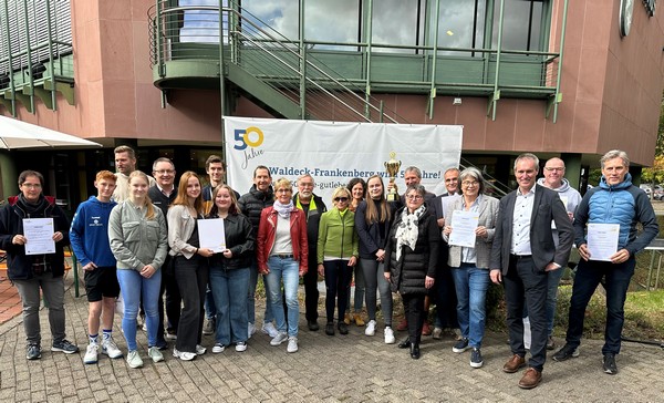 Korbach(pm). 20 Kommunen haben teilgenommen, 91 Tonnen CO² wurden eingespart, 548.828 Kilometer zurückgelegt – Landrat Jürgen van der Horst zeigte sich erfreut über die hervorragende Bilanz des diesjährigen Stadtradelns, das vom 8. – 28. Juni stattfand. „Mit diesem tollen Ergebnis haben wir in Waldeck-Frankenberg den 8. Platz in Hessen erreicht und uns gegenüber dem letzten Jahr sogar um einen Platz gesteigert“, betonte der Landrat. Damit sei der Landkreis außerdem führend in Nordhessen. Im Rahmen der Jubiläumsfeierlichkeiten zum 50-jährigen Bestehen Waldeck-Frankenbergs zeichnete van der Horst zusammen mit Nahmobilitätskoordinatorin Martha Schweizer und Fachdienstleiterin Bauen Susanne Paulus die fleißigsten Stadtradlerinnen und Stadtradler aus. Neben einer Urkunde erhielten die Radelaktivsten Geld- und Sachpreise. Fahrradaktivste Kommune unter 10.000 Einwohnerinnen und Einwohnern, zugleich fahrradaktivstes Kommunalparlament mit 36,3 km/Kopf und auf Platz 4 in Hessen, war die Nationalparkgemeinde Edertal (48.163 km), für die Bürgermeister Klaus Gier einen Zuschuss zum Radwegebau in Höhe von 1.000 Euro entgegennahm. Den gleichen Zuschuss erhielt Bürgermeisterin Barbara Eckes für die Stadt Frankenberg (Eder) als fahrradaktivste Kommune über 10.000 bis 49.999 Einwohnerinnen und Einwohnern (125.117 km). Aktivster Einzelradler war mit 2.853 km wie schon im vergangenen Jahr Reinhold Erb aus Buhlen, das radelaktivste und zugleich auch größte Team der TSV 1921 Eifa (56 aktiv Radelnde, 19.425 Kilometer). Der Verein wurde bei der Auszeichnung durch Fred Lettermann und Klaus Otto vertreten. Außerdem erhielten die drei Teams mit den radelaktivsten Teilnehmenden eine verdiente Auszeichnung: die Hartmänner*innen Sabine und Timo Hartmann (2.007 km), B&E Biker Beate und Hermann Pröpper (1.720 km) sowie das Diakonische Werk Waldeck-Frankenberg (789 km), vertreten durch Anne Maier.