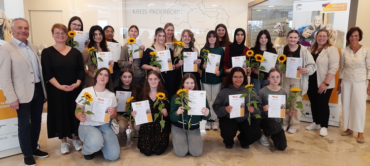 Kreis Paderborn(krpb). 23 Schülerinnen aus dem Kreis Paderborn absolvierten dieses Jahr das Berufsorientierungsprojekt „Pflege? Ehrensache!“ und feierten nun gemeinsam den Abschluss im Foyer des Kreishauses in Paderborn. Das Projekt, das seit 2019 von IN VIA Paderborn e.V. durchgeführt wird, bietet Jugendlichen eine praxisnahe Berufsorientierung im Bereich der Alten-, Kranken- und Kinderkrankenpflege. In ihrer Begrüßungsrede lobte Sabine Höwekenmeier, pädagogische Begleiterin bei IN VIA, das Engagement der Teilnehmerinnen: „Ihr seid wirklich außergewöhnliche Jugendliche. Nicht nur, weil ihr an euren freien Samstagen früh aufsteht, um das Berufsfeld Pflege kennenzulernen, sondern auch, weil ihr euch für einen Beruf interessiert, der immens wichtig ist. Die Pflege ist für uns alle von großer Bedeutung – wir alle werden einmal älter oder krank und brauchen dann kompetente, einfühlsame Fachkräfte.“ Das Projekt besteht aus drei zentralen Säulen: Praxistage in kommunalen Senioreneinrichtungen und den Paderborner Krankenhäusern, Praxistraining an den Paderborner Pflegeschulen sowie Teamtage bei IN VIA, an denen die Schülerinnen ihre Erfahrungen reflektieren und über ihre beruflichen und sozialen Kompetenzen sprechen. In den Pflegeeinrichtungen hatten die Teilnehmerinnen die Möglichkeit, praktische Aufgaben zu übernehmen, wie die Unterstützung beim Anziehen oder die Begleitung der Bewohnerinnen und Bewohner bei kleinen Spaziergängen. In den Pflegeschulen erwarben sie pflegerische Grundkompetenzen wie z. B. das Anlegen von Verbänden oder den Umgang mit Rollstühlen. Eine besondere Resonanz zeigten die Rückmeldungen der Schülerinnen, die während der Abschlussveranstaltung ihre Erlebnisse teilten. „Mein schönster Moment war, die Bewohner glücklich zu sehen, als sie beim Rommé gewonnen haben,“ erzählte eine Schülerin. Andere hoben herausfordernde Momente des Pflegealltags hervor, wie zum Beispiel die Unterstützung bei den Mahlzeiten oder das Heben und Lagern der Patientinnen und Patienten.
