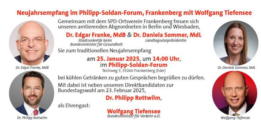 Frankenberg(pm). Der Bundestagsabgeordnete Dr. Edgar Franke und die heimische SPD-Landtagsabgeordnete Dr. Daniela Sommer laden am Samstag, den 25. Januar 2025 zu ihrem Neujahrsempfang ein. Die Abgeordneten wollen sich mit ihrem Empfang bei den Genossinnen und Genossen sowie bei ihren Unterstützern im vergangenen Jahr bedanken. Der Neujahrsempfang findet am Samstag, den 25. Januar 2025, um 14 Uhr im Philipp-Soldan-Forum, Teichweg 3 in 35066 Frankenberg statt. Mit dem Ortsverein Frankenberg werden die Gastgeber für einen abwechslungsreichen Nachmittag sorgen. In diesem Jahr steht die vorgezogene Bundestagswahl im Fokus. Mit dabei wird neben dem Direktkandidaten der SPD zur Bundestagswahl am 23. Februar 2025, Dr. Philipp Rottwilm, Bürgermeister der Gemeinde Neuental, als Ehrengast auch der ehemalige Bundesminister für Verkehr, Wolfgang Tiefensee, sein.