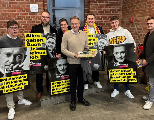 kämpfen für jede Stimme für die Freiheit“, erklärte Leon Hamm, Vorsitzender des Bezirksverbands der Jungen Liberalen Kurhessen. Die JuLis Kurhessen machten damit auf die Gefahren aufmerksam, die von persönlichen Angriffen auf Politikerinnen und Politiker ausgehen. „Angriffe auf Politiker schaden nicht nur dem politischen Klima, sondern zeugen auch von der argumentativen Inhaltslosigkeit der Angreifer. Mit unserem Geschenk an Christian Lindner wollen wir mit Humor zeigen, dass uns solche Angriffe in unserem Engagement nur bestärken“, so Hamm weiter. Im Anschluss fand eine gemeinsame Fotoaktion mit FDP-Chef Lindner statt, bei der die JuLis Kurhessen ihren Einsatz für den Liberalismus bestärkten. Dabei hielt der FDP-
