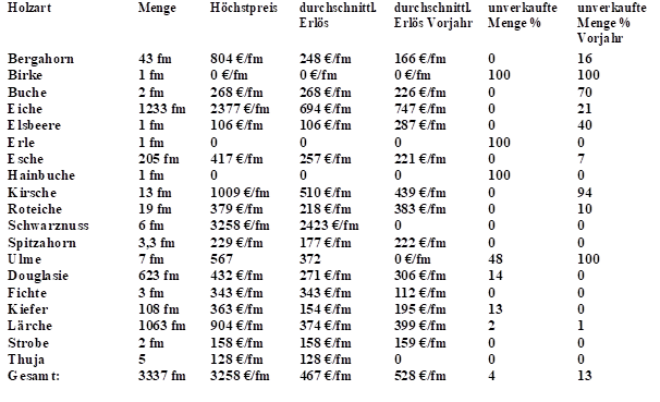Die teuerste Eiche erzielte einen Preis von 2377 €/fm und kommt aus dem Staatswald des Forstamtes Reinhardshagen. Sie wurde von einem Deutschen Furnierhersteller erworben. Neben gesundem Holz waren viele der angebotenen Stämme aufgrund der Trockenheit und Wärme der letzten Jahre geschädigt oder abgestorben und mussten daher geerntet werden. Der erzielte Erlös hilft allen beteiligten Waldbesitzenden bei der Finanzierung der jetzt nötigen und umfangreichen Wiederbewaldung in artenreiche, klimastabile Mischwälder. Die beteiligten Waldbesitzenden zeigten sich mit dem erzielten Ergebnis zufrieden.