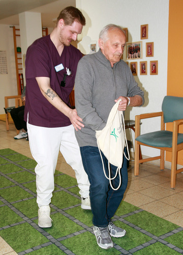 Gehen und gleichzeitig den Schlüssel aus der Tasche kramen: Ergotherapeut Lucas Büchel übt mit Herrn Frey aus Marienhagen.