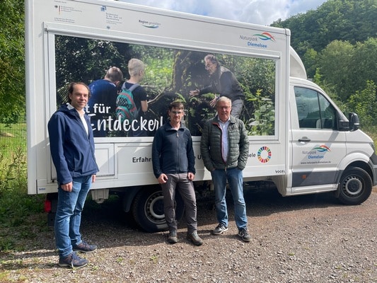 Ein weiteres Highlight stellte das seit 2023 in Betrieb genommene Umweltbildungsmobil dar – ein „fahrendes Klassenzimmer“, das altersgerechte Programme zu den Themen Wald, Wasser, Boden und Klima anbietet. „Mit diesem mobilen Angebot erreicht der Naturpark Kinder und Jugendliche direkt dort, wo sie sind – ob im Kindergarten, in der Schule oder bei Projekttagen in der Natur. So wird Umweltbildung für alle zugänglich“, erklärten die Abgeordneten Daniel May und Jürgen Frömmrich. Dank moderner digitaler Ausstattung können Kinder und Jugendliche erforschen, wie sich der Klimawandel auf lokale Ökosysteme auswirkt. Das Projekt verdeutlicht, dass Klimawandel auch vor Ort spürbare Folgen hat und Klimaschutz sowie Anpassungsmaßnahmen regional anzugehen sind. „Wir sind sehr beeindruckt, wie der Naturpark mit diesen Projekten ein hochwertiges Bildungsangebot geschaffen hat und damit zugleich zu den 17 UN-Nachhaltigkeitszielen beiträgt“, so die beiden Abgeordneten.