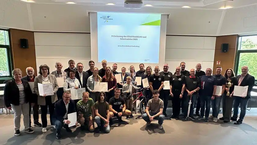 einer feierlichen Preisverleihung die erfolgreichsten Teams, Schulen, Kommunen und Einzelfahrende für ihre herausragenden Leistungen ausgezeichnet. Neben Urkunden und Sachpreisen gab es viel Applaus für alle, die durch ihre Teilnahme ein Zeichen für eine nachhaltige Mobilität gesetzt haben. Alle Ergebnisse können auf der Internetseite des Landkreises www.landkreis-waldeck-frankenberg.de unter dem Stichwort „Stadtradeln 2025“ eingesehen werden. Erster Kreisbeigeordneter Karl-Friedrich Frese lobte den starken Einsatz, den die Bürgerinnen und Bürger beim STADTRADELN gezeigt haben: „Radfahren schützt das Klima, hält fit und stärkt die Gemeinschaft. Das Engagement aller Teilnehmenden zeigt, dass unser Landkreis aktiv zum Klimaschutz beiträgt und Radverkehr immer mehr an Bedeutung gewinnt.“ Insgesamt beteiligten sich in diesem Jahr 2.646 Radelnde aus den 21 Kreis-Kommunen, die gemeinsam 638.409 Kilometer zurücklegten. Damit konnten rund 105 Tonnen CO₂ vermieden werden – ein starkes Ergebnis, das die Dynamik des Radverkehrs in der Region unterstreicht.