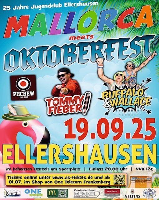 Ellershausen(pm). Dieses Jahr feiert der Jugendclub Ellershausen nicht nur sein alljährliches Oktoberfest, sondern auch sein 25-jähriges Bestehen! Freut euch auf zwei unvergessliche Partys mit fantastischen Künstlern, top DJs und natürlich dem besten Partyvolk der Region.