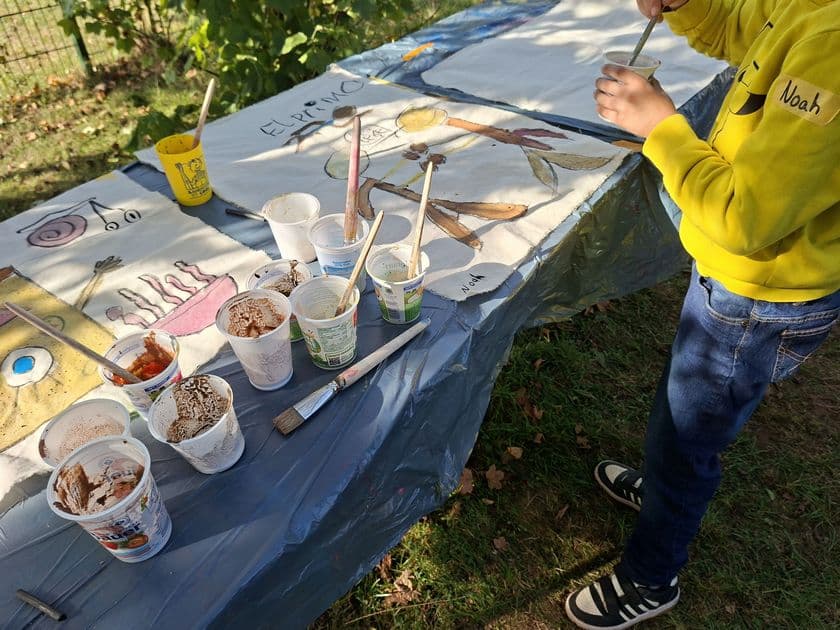 Korbach(pm). Der Nationale Geopark GrenzWelten hat seine wertvolle Bildungsarbeit um ein ganz besonderes Projekt erweitert. Beim „Künstlerischen Gestalten mit Erdfarben“ konnten Kinder im Grundschulalter erleben, dass sich mit natürlichen Materialien „echte“ Bilder herstellen lassen. Unter Anleitung der Künstlerin Gerlinde Vestweber, die ihren Workshop auf Einladung des Geoparks anbot, schufen die Mädchen und Jungen wahre Kunstwerke. Als Material hatte die Künstlerin Leinwände, Farben, Binder, Erdfarben, Pigmente und Holzrahmen mitgebracht. Zu Beginn erklärte sie den Kindern die Erdfarben: Kalk in einer beigen Farbe, rötlicher Buntsandstein, dunkle Gartenerde und eine durch Kohleanteile sehr dunkle Erde. In der Wahl ihres Motivs waren die kleinen Künstlerinnen und Künstler frei – Vorgabe war lediglich, erst die Erdfarben zu verwenden und erst später die Pigmente, um mit ihnen noch einmal farbliche Akzente zu setzen. Die Kinder waren begeistert von den Materialien und gingen eifrig und sehr kreativ an die Gestaltung ihrer Werke. So entstand eine große Bandbreite unterschiedlicher Motive. Während die Werke zum Trocknen an Wäscheleinen hingen, erklärte Gerlinde Vestweber den Zusammenbau der Rahmen, die von den Kindern ebenfalls selbst erstellt wurden. Zum krönenden Abschluss wurden die getrockneten Leinwände schließlich auf die Rahmen gespannt und befestigt.