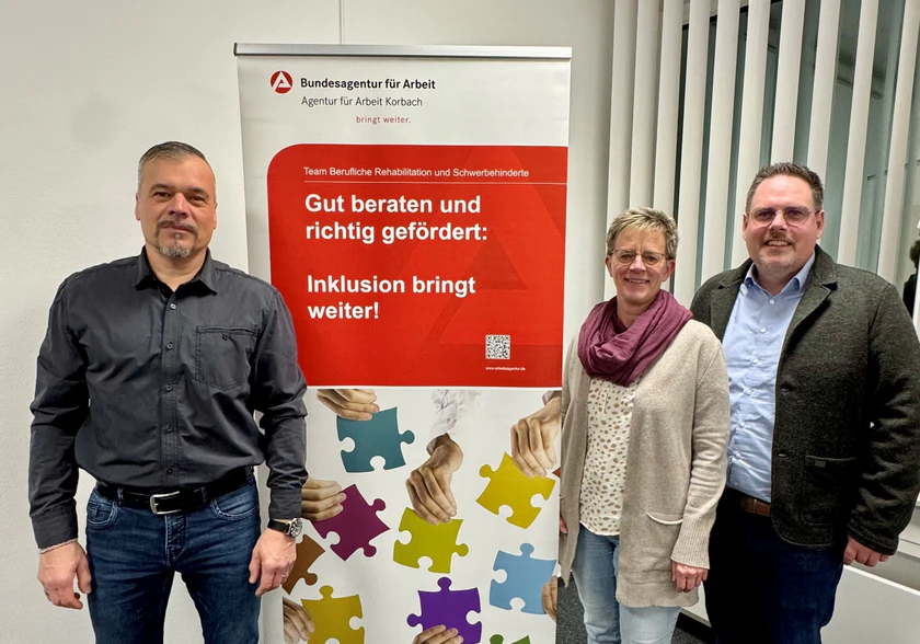 Korbach(pm). Menschen mit Behinderung sind ein wichtiger Teil unserer Gesellschaft und bereichern den Arbeitsmarkt mit ihren Fähigkeiten, Perspektiven und Erfahrungen. Die Bundesagentur für Arbeit setzt sich deshalb mit Nachdruck dafür ein, dass Inklusion in der Arbeitswelt Wirklichkeit wird und unterstützt die heute beginnende bundesweite Woche der Menschen mit Behinderung (28. November bis 5. Dezember 2025). Ziel ist es, Barrieren abzubauen, Chancen zu eröffnen und gemeinsam mit Arbeitgeberinnen und Arbeitgebern Wege zu finden, damit Teilhabe am Arbeitsleben für alle möglich ist. Als spezialisierte Ansprechpartner für Arbeitgeber, die Menschen mit Behinderung einstellen wollen, stehen bei der Korbacher Arbeitsagentur seit kurzem Britta Sauerland und Sascha Wilhelm zur Verfügung, erreichbar über die Telefon-Hotline 05631/957-300. Beide gehören zum Team Berufliche Rehabilitation/Teilhabe der Agentur und bringen Erfahrungen als Arbeitsvermittler mit. Das heißt, sie kennen sich bestens mit den Schwierigkeiten und Chancen von Rehabilitanden bzw. Menschen mit Behinderung aus, die erstmals oder wieder ins Berufsleben einsteigen wollen. „Es gibt sehr fachspezifische und individuelle Fördermöglichkeiten für Betriebe, die Menschen mit Behinderung ausbilden oder beschäftigen“, berichtet Britta Sauerland. „Das kann zum Beispiel ein Praktikum zur Eignungsfeststellung, ein Eingliederungs- oder Ausbildungszuschuss oder eine geförderte Probebeschäftigung im Einzelfall sein. Wir beraten die Arbeitgeber und prüfen, ob und in welcher Höhe eine Förderung möglich ist.“ Ein Eingliederungszuschuss sei beispielsweise denkbar, wenn der Arbeitnehmer in der ersten Zeit im Unternehmen noch nicht die volle Arbeitsleistung erbringt und sich noch Fähigkeiten aneignen muss. Je länger und aufwändiger dies ist, desto höher kann die Förderung ausfallen.