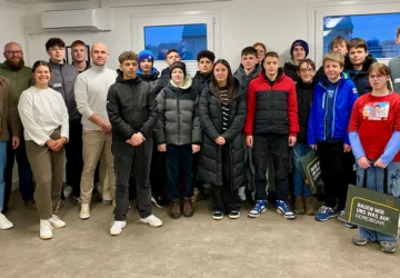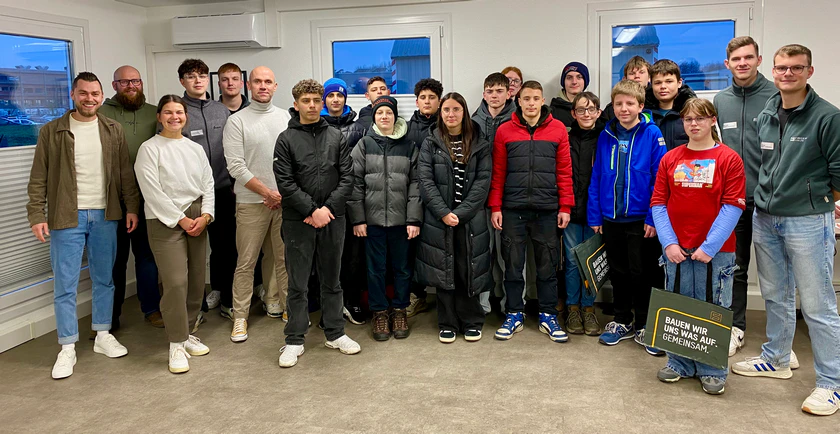 Frankenberg(pm). Insgesamt 20 Schülerinnen und Schüler der Ortenbergschule Frankenberg und der Gesamtschule Battenberg nahmen auf Initiative des Arbeitskreises Schulewirtschaft Waldeck-Frankenberg am „Azubi Walk“ bei FingerHaus teil. Die besondere Form der Betriebsführung wurde von Auszubildenden des mehrfach ausgezeichneten Fertighausherstellers durchgeführt und bot den Jugendlichen einen praxisnahen Einblick in Produktionsprozesse, moderne Fertigungstechniken und die vielfältigen Ausbildungsmöglichkeiten im Unternehmen. Organisiert wurde der Unternehmensbesuch durch Peter Weber, Sprecher von Schulewirtschaft Waldeck-Frankenberg, der den Azubi Walk gemeinsam mit seinem Sprecherkollegen Jörg Battefeld begleitet und moderiert hat. „Momente wie diese geben jungen Menschen Mut und Perspektive“, betont der Pädagoge. „Wir möchten jungen Menschen authentisch zeigen, wie spannend und vielfältig die Arbeit in der modernen Holzfertighausproduktion ist. Der Azubi Walk ist dafür ideal, denn hier berichten Auszubildende direkt aus ihrem Alltag – offen, nahbar und auf Augenhöhe“, erklärt Jannik Gasse, Leiter der Ausbildung bei FingerHaus.