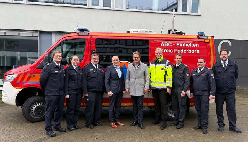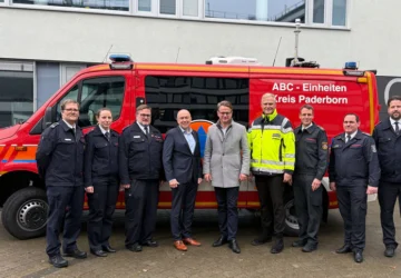 Kreis Paderborn(krpb). Der Katastrophenschutz im Kreis Paderborn hat eine Verstärkung erhalten: Ein hochmoderner chemischer, biologischer, radiologischer und nuklearer Erkundungswagen (CBRN ErkW) des Bundes ist im Kreis Paderborn stationiert worden und ersetzt den über 20 Jahre alten Vorgänger. Das Spezialfahrzeug wird dem Kreis Paderborn vom Bund zur Verfügung gestellt, es dient der Aufspürung und Messung von chemischen, biologischen, radiologischen sowie nuklearen Gefahren. Die Stationierung des neuen Fahrzeugs mit Spezialausbau erfolgt bei der Freiwilligen Feuerwehr in Delbrück und knüpft damit an eine lange Tradition an: Bereits im Jahr 2001 wurde hier der erste ABC-Erkunder in Betrieb genommen, als der Katastrophenschutz im Kreis Paderborn neu organisiert und als ein Teil der ABC-Einheit in Delbrück stationiert wurde. Maik Sellemerten und Benedikt Schmertmann als Leitungsteam der ABC-Einheiten sowie Karl Wübbe und seine Tochter Rebekka als Einheitsführung, alle zugleich Einsatzkräfte der Freiwilligen Feuerwehr Delbrück, zeigen sich für das Fahrzeug verantwortlich.
