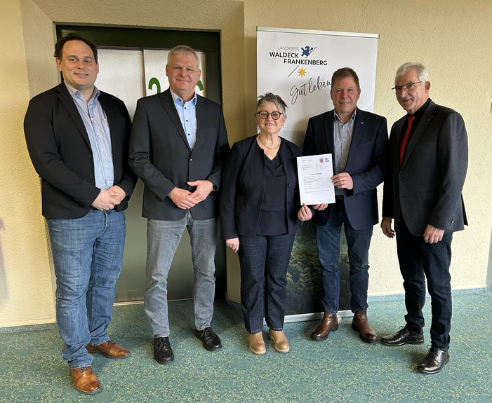 Korbach/Vöhl(pm). Über ein vorgezogenes Weihnachtsgeschenk konnte sich der Landkreis Waldeck-Frankenberg zu Beginn der Kalenderwoche 51 freuen. Aus dem Wiesbadener Wirtschaftsministerium war der Landesbeauftragte für den ländlichen Raum Knut John angereist, um persönlich einen Förderbescheid über 1.573.600 Euro zu übergeben. Die finanzielle Unterstützung wurde im Rahmen der Verkehrsinfrastrukturförderung in Hessen nach dem Mobilitätsfördergesetz gewährt und dient dem Ausbau der Kreisstraße K 25 in mehreren Bauabschnitten; die K 25 verläuft vom Abzweig der L 3084 (Vöhl-Alraft) nach Hof Lauterbach über Obernburg bis zur Anbindung an die B 252 bei Dorfitter. Kosten und Baulastträger des Gesamtvolumens dieser Maßnahmen von über 2 Millionen Euro ist der Landkreis Waldeck-Frankenberg. Landesbeauftragter John betonte bei der Übergabe des Förderbescheides die Bedeutung einer qualitativ hochwertigen Verkehrsinfrastruktur nicht nur in den Ballungsgebieten, sondern vor allem im ländlichen Raum. Gerade im Landkreis Waldeck-Frankenberg mit seinen 490 Kilometern an Kreisstraßen werde ein funktionierendes Verbindungsnetz gebraucht, um eine hohe Lebensqualität aufrecht zu erhalten. „Die K 25 stellt für die Menschen in der Gemeinde Vöhl eine wichtige Anbindung vor allem nach Korbach dar“, bestätigte Erster Kreisbeigeordneter Karl-Friedrich Frese. Ob zur Verkehrssicherheit im Schulbusbetrieb oder für den Rettungsdienst, dem Landkreis sei sehr an einer sinnvollen, zweckmäßigen und wirtschaftlichen Erschließung aller Kommunen gelegen. So sei es trotz der schwierigen Haushaltslage selbstverständlich gewesen, im Kreisetat 2026 mit 10 Millionen Euro erneut eine hohe Summe für den Kreisstraßenbau vorzusehen.