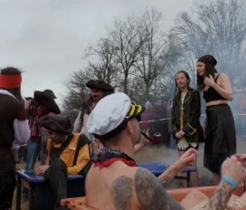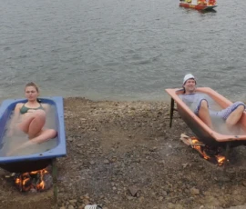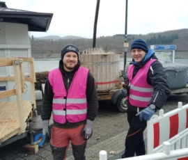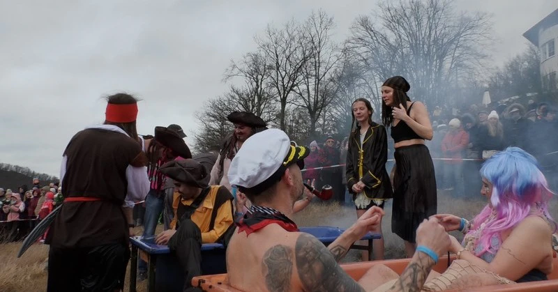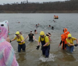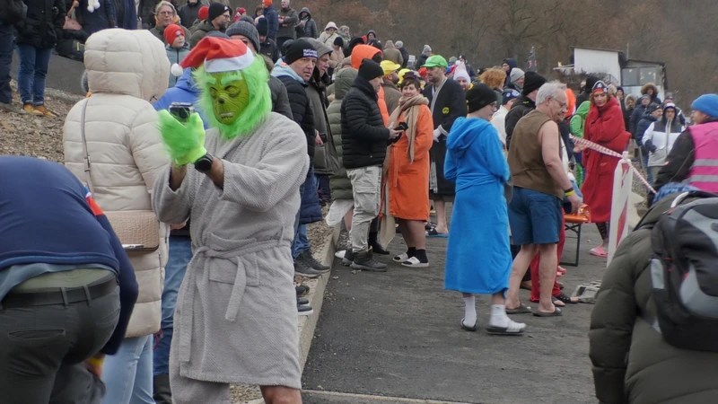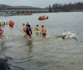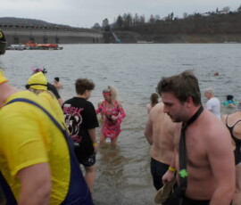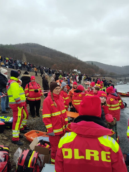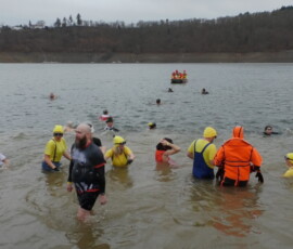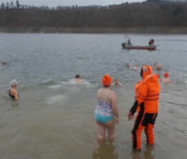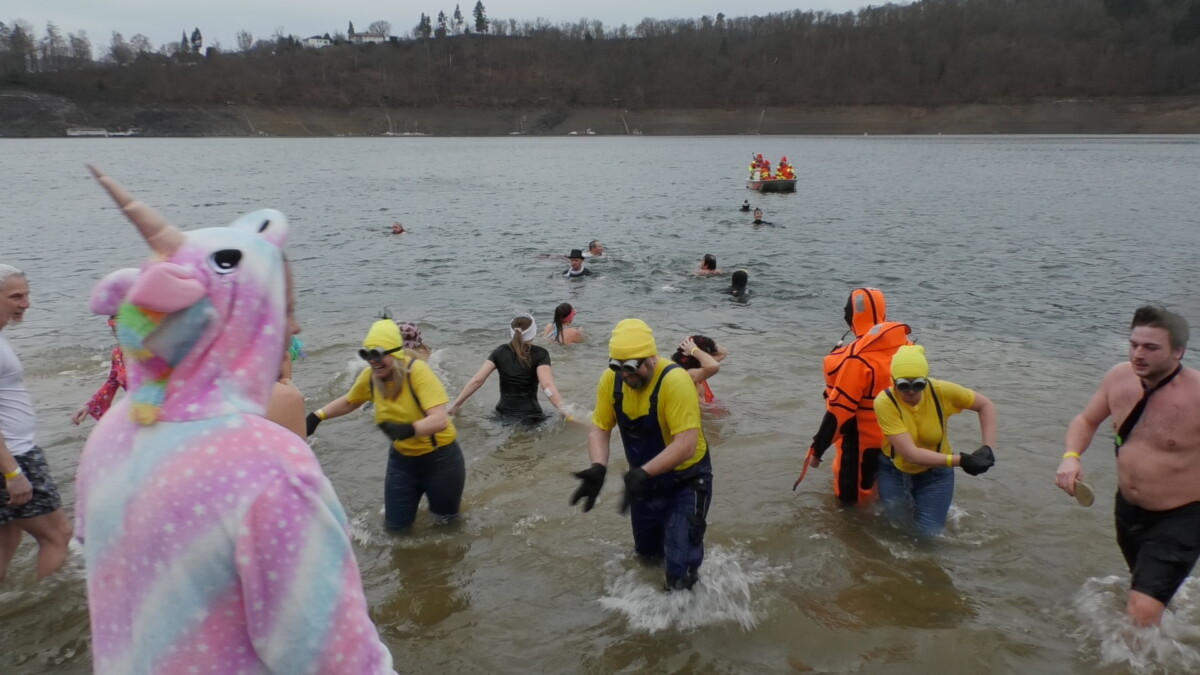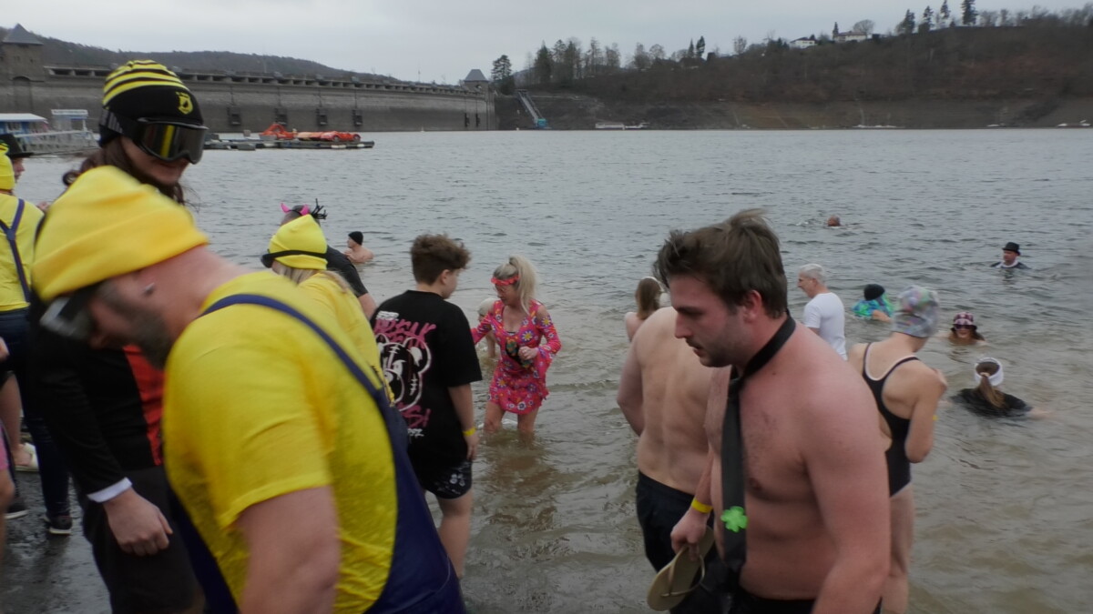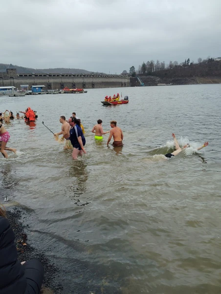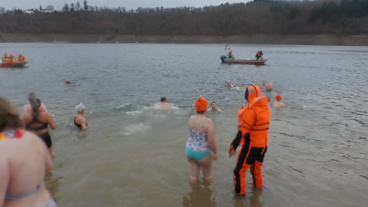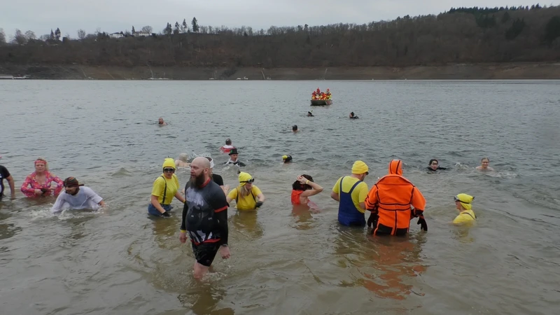 Sperrmauer-Ostseite(od). Zum 18. Mal fand das traditionellen Neujahrsschwimmen, organisiert vom Bürgerverein Hemfurth-Edersee und moderiert von Helge Maurer statt. Trotz Schneegriesel, Lufttemperaturen um den Gefrierpunkt und starker Wind sprangen über 350 mutige Schwimmerinnen und Schwimmer in den Edersee, der von exakt null Grad aufwies. Über 2000 Zuschauer verfolgten das Spektakel vom Ufer aus.