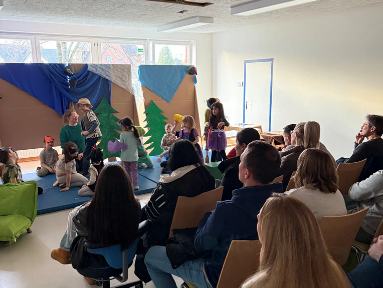 Kreis Paderborn(krpb). Geschichten wecken Fantasie. In der Städtischen Kita Lange Wenne in Paderborn wurde aus einer Vorlesegeschichte jetzt lebendiges Theater: 22 Kitakinder mit und ohne internationale Familiengeschichte entwickelten aus einem Buch ein eigenes Stück. Sie schlüpften in verschiedene Rollen und brachten ihre eigenen Ideen auf die Bühne. „Komm, wir lesen eine Geschichte“, ist Titel eines Projektes, das vom Kommunalen Integrationszentrum im Bildungs- und Integrationszentrum Kreis Paderborn (BIZ) entwickelt wurde mit dem Ziel, Kinder in der Übergangsphase zur Grundschule spielerisch in ihrer Sprachkompetenz zu fördern. Die Eltern werden mit eingebunden und in ihrer Vorlesekompetenz gestärkt. Warum es wichtig ist, Büchern und Geschichten regelmäßig Raum zu geben, darüber informierte im Anschluss an die Aufführung Theresa Trieu vom BIZ die anwesenden Eltern. „Schon wenige Minuten Lesezeit, eingebaut als Ritual in den Alltag, wecken Kreativität und Neugierde auf Literatur. Sie fördern Nähe und Konzentration und schaffen bestmögliche Bedingungen für einen guten Start in die Schule“, so die Mitarbeiterin des Kreises Paderborn.