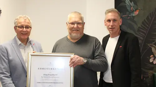 Ehrung mit besonderer Anerkennung: Kreishandwerksmeister Ulrich Mütze (links) und Geschäftsführer Kai Bremmer (rechts) überreichten Jörg Engelhard die Ehrenurkunde zum Ehrenkreishandwerksmeister. Foto: Kreishandwerkerschaft Waldeck-Frankenberg