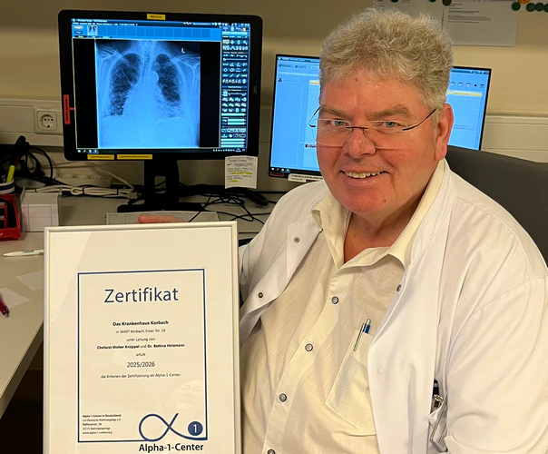Korbach(pm). Das Korbacher Krankenhaus wurde offiziell als Alpha-1-Zentrum zertifiziert. Damit gehört die Klinik zu den spezialisierten Einrichtungen in Deutschland, die eine qualitätsgesicherte Diagnostik, Therapie und Betreuung von Patienten mit Alpha-1-Antitrypsin-Mangel anbieten.  Die Zertifizierung erfolgte durch die Deutsche Atemwegsliga, unter der fachlichen Leitung von Chefarzt Walter Knüppel, der mit seinem Team in den vergangenen Jahren gezielt die pneumologische Expertise ausgebaut und strukturierte Behandlungsabläufe etabliert hat. Die Auszeichnung bestätigt die hohen medizinischen Standards sowie die interdisziplinäre Zusammenarbeit innerhalb des Hauses. „Die Zertifizierung als Alpha-1-Zentrum ist eine wichtige Anerkennung unserer kontinuierlichen Arbeit im Bereich der Lungenerkrankungen“, betont Chefarzt Walter Knüppel. „Unser Ziel ist es, Betroffenen eine frühzeitige Diagnose, eine individuell abgestimmte Therapie und eine langfristige Begleitung auf höchstem medizinischem Niveau zu ermöglichen.“