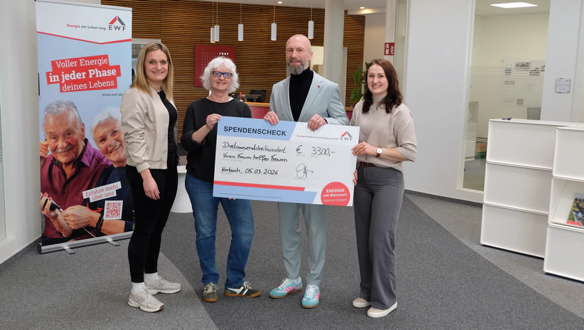 Korbach(pm). Für die Spendeninitiative „Bewegt durch 2025“ erreichten die Mitarbeitenden der Energie Waldeck-Frankenberg (EWF) im vergangenen Jahr eine Rekordsumme. Der EWF-Geschäftsführer Frank Benz und EWF-Mitarbeiterin Sophie Kümmel übergaben am 5. März den ersten Spendenscheck über 3.300 Euro an den Verein Frauen helfen Frauen. Das Geld wird für das Frauenhaus in Bad Wildungen verwendet. Bei der Übergabe bedankten sich Irina Gebel und Gundula Schmieding für die Unterstützung und erläuterten, wofür die Mittel eingesetzt werden sollen. Die Initiative des heimischen Energieversorgers „Bewegt durch 2025“ dient dazu, alle Mitarbeitenden im Unternehmen zu motivieren in ihrer Freizeit Sport zu treiben und aktiv zu bleiben. Für jede Trainingseinheit im Fitnessstudio oder jeden Kilometer per Fahrrad zahlt die EWF eine festgelegte kleine Spende für den guten Zweck. So entstand eine Spendensumme in Höhe von 7.300 Euro. Der Mitarbeiter mit dem höchsten Spendenbetrag von 406,60 Euro legte eine Fahrradstrecke von mehr als 4.000 Kilometer zurück.