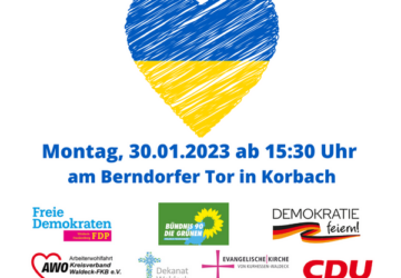 Korbach(pm). Bald jährt sich der Beginn des Angriffskrieges Russlands auf die Ukraine. Seit dem 24. Februar 2021 sind Putin und seine Helfershelfer verantwortlich für millionenfaches Leid und eine fortwährende verbrecherische und menschenverachtende Kriegsführung. SPD, Bündnis 90 / Die Grünen, FDP, CDU, Freie Wähler in Waldeck-Frankenberg, der DGB Kreisverband, die katholische Kirche, die evangelische Kirche, die AWO, das Netzwerk für Toleranz, die Arbeitsgruppe Region gegen Rassismus, das Projekt DemokratieFeiern und gewaltfrei handeln e.V. rufen daher am Montag, 30.01.2023 um 15:30 Uhr in Korbach, Berndorfer Torplatz (‚Loch‘) erneut zur „Kundgebung für den Frieden“…