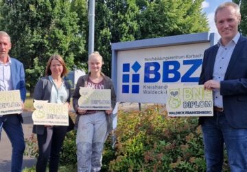 Korbach(pm). Zukunftsfähig denken und handeln: Mit diesem Ziel wird der Unterricht im Rahmen der Initiative „Bildung für nachhaltige Entwicklung“, kurz BNE, an vielen Schulen gestaltet. Schulklassen, die BNE in ihren Unterricht integrieren, erhalten eine Holzbeschilderung vom Landkreis Waldeck-Frankenberg und können diese in ihrem Klassenraum aushängen. Auch in diesem Jahr unterstützt das Berufsförderungswerk des Handwerks – die Bildungseinrichtung der Kreishandwerkerschaft – den Landkreis, indem die Auszubildenden Holzschilder während der praktischen Arbeit in der Holzwerkstatt produzierten. Geschäftsführer Kai Bremmer übergab am Standort der Kreishandwerkerschaft in Korbach im Herbst die Schilder nun an…