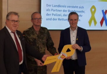 Korbach(od). In Anerkennung und Wertschätzung für die Bundeswehr, die Feuerwehr, den Rettungsdienst und die Polizei hat der Kreistag des Landkreis Waldeck-Frankenberg die Anbringung symbolischer gelber Schleifen und rot, weiß, blauer Schutzschleifen in den Eingangsbereichen der Kreisverwaltung beschlossen. Hauptmann Martin Wurz vom Förderverein Stab schnelle Einsatzkräfte e.V. übergab die gelbe Schleife an Landrat Jürgen van der Horst und den Kreistagsvorsitzenden Rainer Hesse. Dem Kreistagsvorsitzenden Rainer Hesse war es ein persönliches Anliegen, die Solidarität mit den Einsatzkräften zu zeigen, aber auch der Kreistag war sich in der Solidaritätsbekundung einig. Die Gelbe Schleife ist als Awareness…