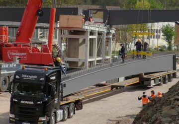 Neue Brücke über Bahn, Bundesstraße und Kuhbach erhält Überbau Dorfitter(pm). Die große Brücke der Kreisstraße K 25 von Obernburg kommend, über die neue Trasse der Bundesstraße, die Bahnlinie und den Kuhbach in Richtung Dorfitter, erhält in den nächsten Wochen ihren Überbau. Ab dem 05. Mai wurden zunächst die stählernen Hohlkastenprofile angeliefert und mit Mobilkran eingehoben. Bereits in der Nacht von Donnerstag auf Freitag wurden die Elemente von der Produktionsstätte in Thüringen über die Autobahn und Bundesstraße transportiert und dann über die neue Trasse der Ortsumgehung bis zur Einbaustelle sukzessive angefahren.…