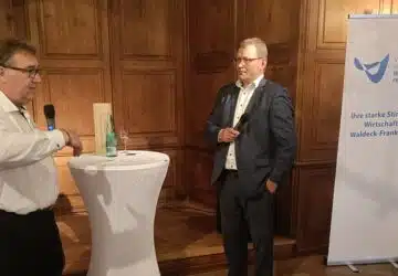 Waldeck(pm). Unter dem Motto „Wirtschaft gestalten – Region stärken“ begrüßte die Vereinigung der Wirtschaft Waldeck-Frankenberg e.V. (VdW) am 26.06.2025 rund 75 Unternehmerinnen und Unternehmer zum diesjährigen Sommerfest im festlich geschmückten Rittersaal des Hotels Schloss Waldeck. Regierungspräsident Mark Weinmeister beantwortete nach einem persönlichen Grußwort die Fragen der Mitglieder und sagte dabei unter anderem: „Auch ich würde mich freuen, wenn wir im RP nicht kontinuierlich neue Aufgaben aufgrund bürokratischer Vorgaben bekämen. Ich könnte meine Mitarbeiter dann viel zielgerichteter einsetzen.“ Carsten Rohlfs, Vorsitzender der VdW, stellte in seiner Eröffnungsrede zunächst die aktuellen wirtschaftlichen Herausforderungen…