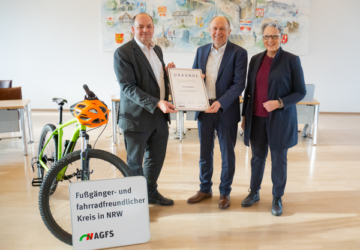 Staatssekretär Viktor Haase und AGFS-Vorstand Christine Fuchs überreichen Mitgliedsurkunde an Landrat Rüther Kreis Paderborn(krpb). Paderborns Landrat Christoph Rüther begrüßte am heutigen Freitag im Kreishaus hohen Besuch. Viktor Haase, Staatssekretär im Ministerium für Umwelt, Naturschutz und Verkehr des Landes Nordrhein-Westfalen, war beim Kreis zu Gast und das aus gutem Grund: Ab sofort ist der Kreis 99. Mitglied der Arbeitsgemeinschaft fußgänger- und fahrradfreundlicher Städte, Gemeinden und Kreise in Nordrhein-Westfalen e.V. (AGFS NRW). „Der Rad- und Fußverkehr bildet gemeinsam mit Bus und Bahn die zentrale Säule der Mobilitätswende. Ihre Stärkung ist wichtiges Ziel der…